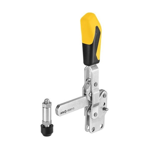 Pince verticale avec poignée jaune, avec bras de maintien solide et pied vertical.