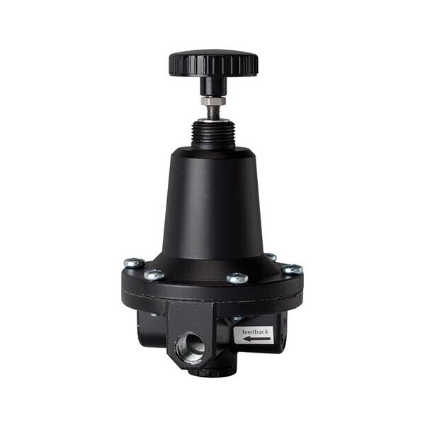 Regulador de aire de control de precisión (regulador de retroalimentación), sin manómetro, G 1/4, rango de regulación 0, 2 - 7 bar, presión de entrada máx. 16 bar. Regulador de presión de membrana para sistemas de retroalimentación, especialmente diseñado para su uso en un circuito de regulación cerrado controlado neumáticamente en combinación con un regulador de presión neumático controlado a distancia.