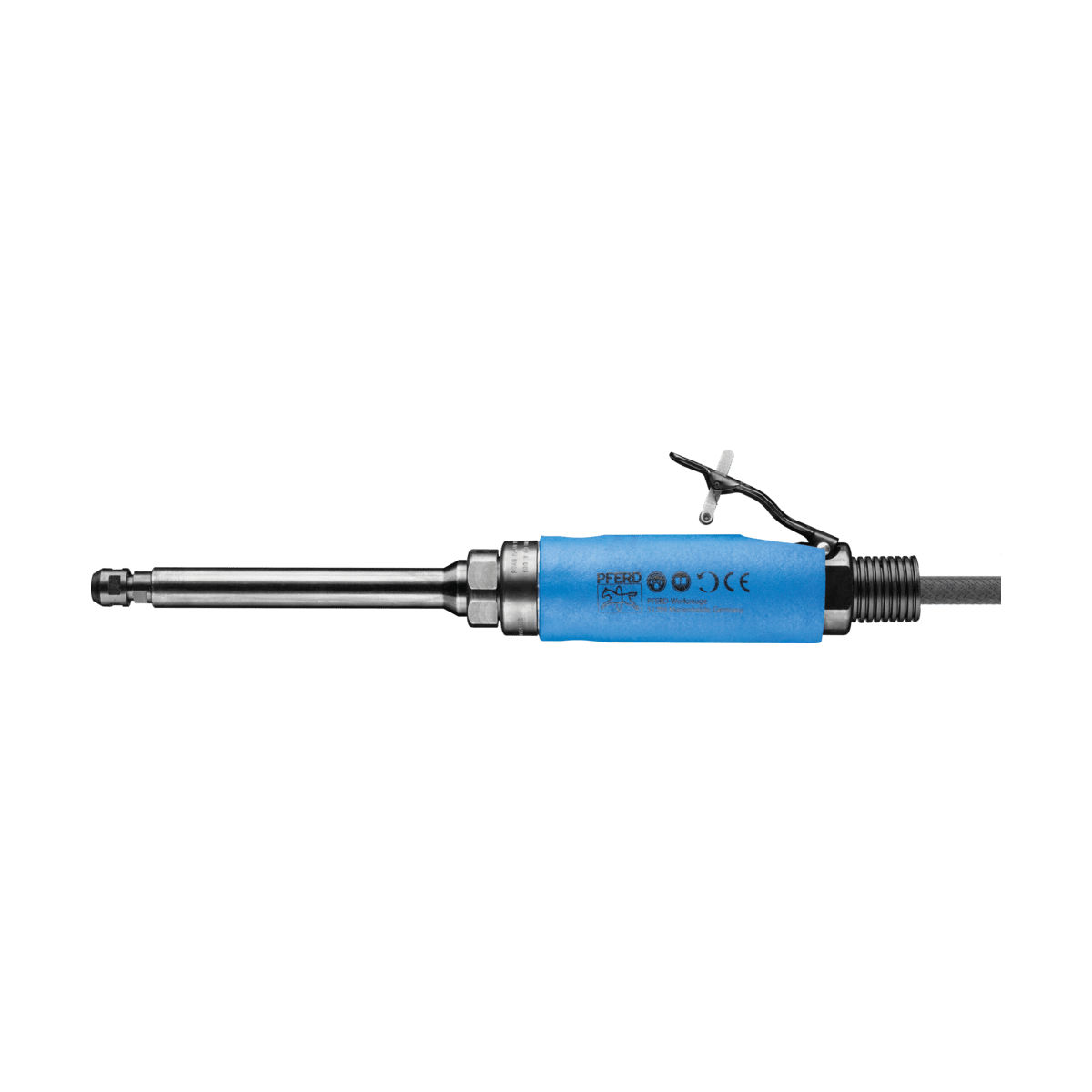 Der Antrieb ist mit einer Spannzangenwerkzeugaufnahme für Schaftwerkzeuge ausgestattet. Die Abluftführung des Druckluftantriebs befindet sich hinten. Der Druckluftantrieb muss mit Öl verwendet werden. Der Antrieb besticht durch seine verlängerte Ausführung sowie seine besonders schlanke Verlängerung. Durch das Hebelventil verfügt der Antrieb über eine Totmannschaltung. 1 m Ab- und 3 m Zuluftschlauch mit Gewindeanschluss 1/4“ außen und Stecktülle mit Gewinde (STGI), Spannzange 6 mm, 2 Spannschlüssel (EM SW 7/16“,EM SW 9/16“).