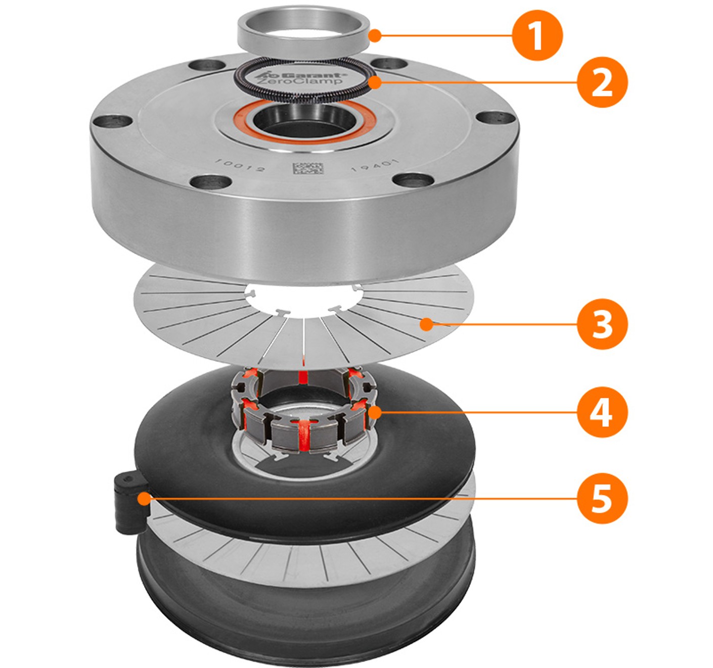 - When the pressure in the air hose is released GARANT ZeroClamp positions the workpiece on the flat face with a clamping force of 25 kN (∅ 120 mm) and 2.5 μm repetition accuracy.