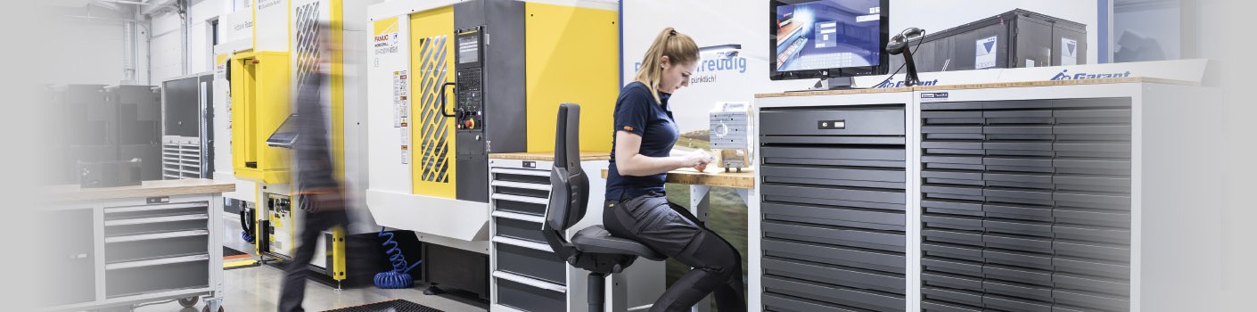 In addition to tool issuing systems, workstations and storage also include workstation systems, tool cabinets, roller cabinets, tool trolleys, storage technology, environmental technology, ladders and platforms and room systems and containers. Find out more about the topics of ergonomics at the work place and the 5S method here. This takes you to the overview.