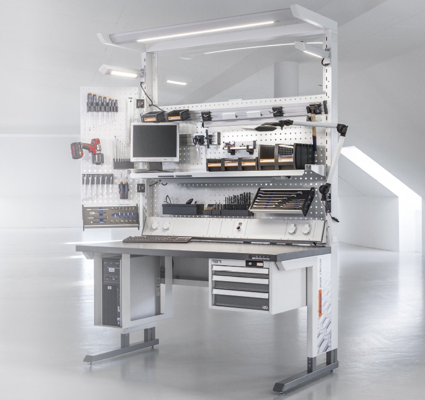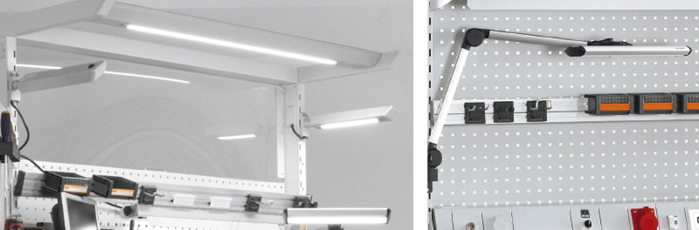 The right light at the right location increases employee productivity, well-being and satisfaction at the workstation. Modern LED lamps are also maintenance-free and reduce energy costs. You need to select the right lighting for the respective circumstances. For example, lighting on the support arms and under the storage shelves, lateral lighting or arm-mounted luminaires. In this way, employees can optimally illuminate not only their workstation but the workpiece as well. As a basic rule, the ideal set-up is a combination of direct and indirect light at the workstation.