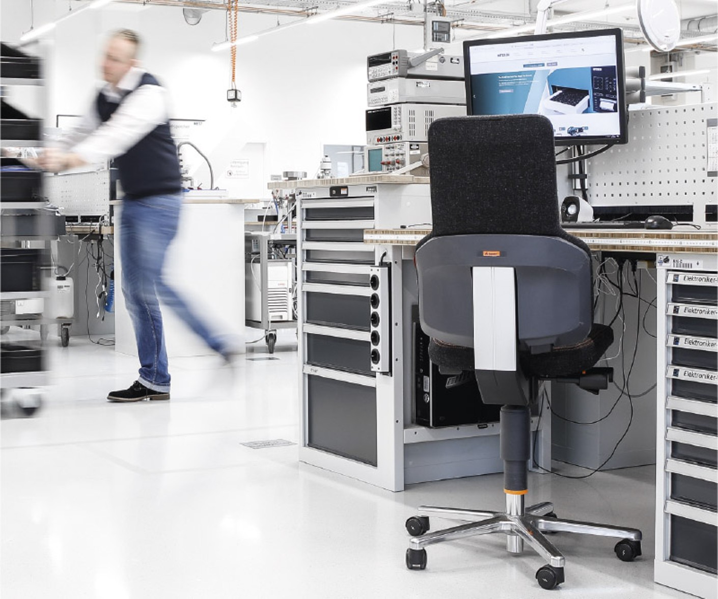 An ergonomic work chair is another important part of workstation equipment, in order to ensure that your employees’ health is not harmed by sitting or standing for an extended period of time. For example, there are swivel work chairs, standing stools and work stools. Protective floor mats are recommended for standing workstations. They come with a flexible surface into which your feet sink slightly, stimulating the circulation.