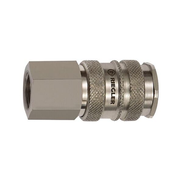 Cuplaj rapid NW 10, oțel / alamă nichelată, G 1/2 IG, presiune de lucru 0-35 bar, temperatura mediului/mediului ambiant. -20 °C până la 100 °C. Cuplaj rapid robust, cu blocare pe o parte și debit ridicat. Pentru a evita rănirea sau „efectul de bici”, recomandăm să țineți ferm cu o mână niplul de cuplare atunci când îl decuplați. Acest cuplaj rapid nu este adecvat pentru montarea directă pe unelte cu pulsare. Recomandăm utilizarea amortizoarelor noastre de vibrații, în conformitate cu ISO 6150, § 7.1. Domenii de aplicare: Pneumatică, construcții de mașini și instalații, tehnică de măsurare, reglare și comandă, industria prelucrătoare, tehnică medicală, industria chimică/farmaceutică, ateliere, industria auto, tehnică alimentară, tehnică aeronautică.